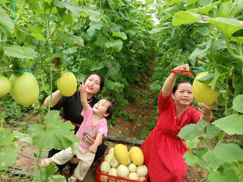 6月17日,游客在江西贛州市贛縣區茅店鎮東田村甜瓜基地體驗采摘樂趣。鐘豪東攝