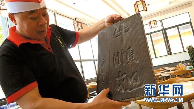 “潮式全牛宴制作技藝”傳承人蔡德溪展示祖傳匾額。他現為第三代傳人。