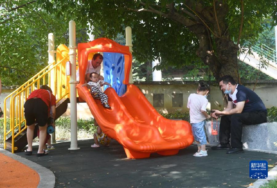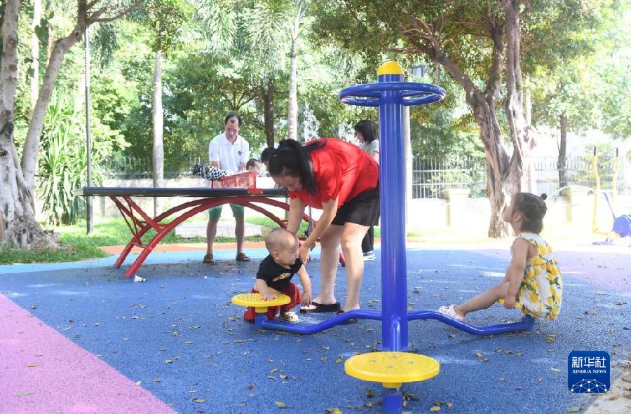 10月10日,在位于廣州市花都區的紫蘭口袋公園里,家長帶著孩子玩耍。