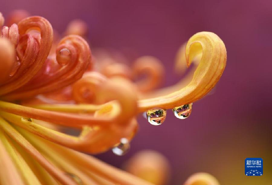10月17日,在云南省麗江市,綻放的菊花上掛著雨珠。