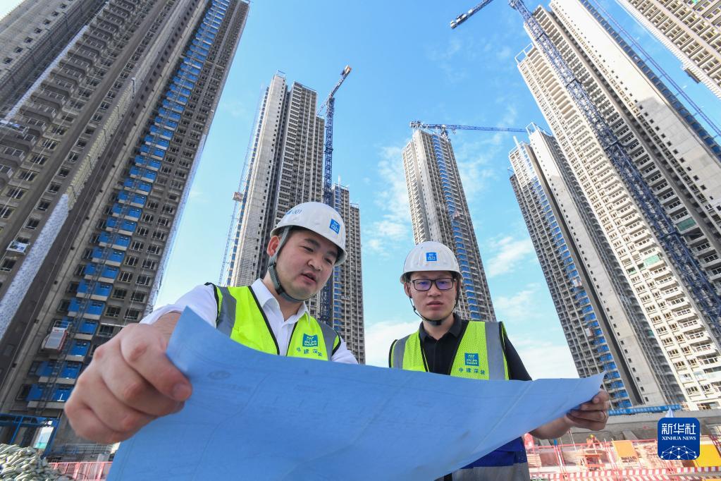 中建深裝項目經理張紅軍(左)和工程師在華富村回遷安置房建設現場進行幕墻裝配技術復核(10月20日攝)。新華社記者 劉大偉 攝