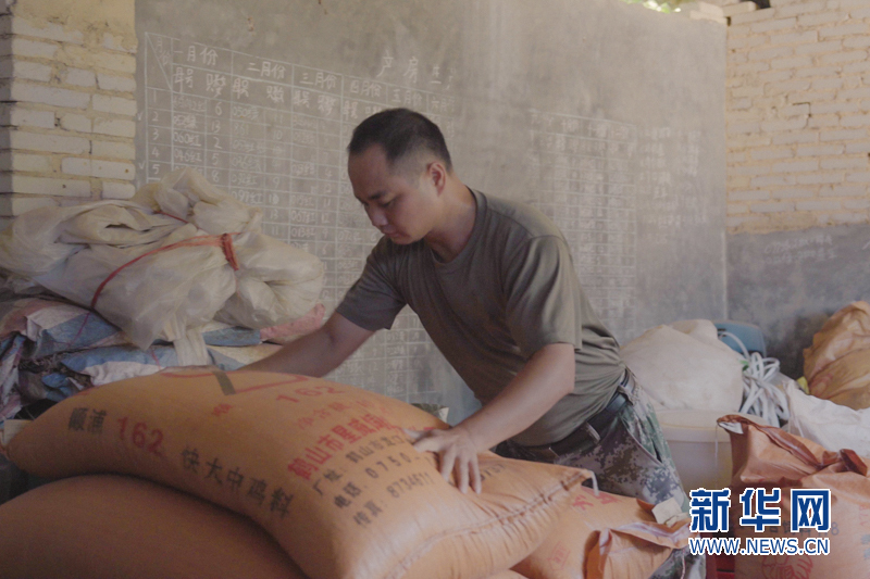 聶炬輝在整理養雞場內的雞飼料,他還常去農戶的雞場查看雞群的情況,并表示希望有更多的人加入,一起把封開杏花雞品牌做大做強。新華網發(張羲輪 攝)