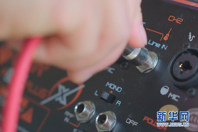 聶炬輝連接音響,準備為“歌迷”們獻唱,讓雞沉浸在音樂環境,在這樣的聲響中覓食,游玩。新華網發(張羲輪 攝)