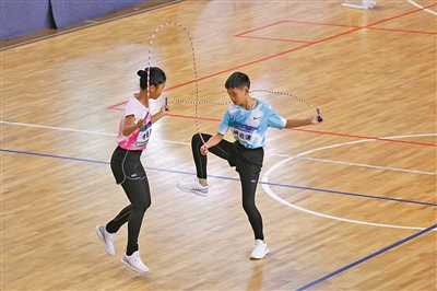 跳繩運動員在廣州市花都體育館參加兩人車輪花樣比賽。(資料圖片)廣州日報全媒體記者蘇俊杰攝