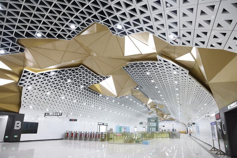 據悉,16號線大運中心站與技術大學站站廳、站臺均采用無柱拱頂設計,相較傳統站點,無柱拱頂車站設計使內部空間更加寬敞通透,客流集散更加通暢。