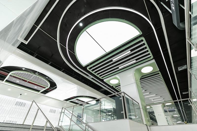 為打造特色無柱拱頂車站,深圳地鐵聯合中國鐵建、北京城建設計院參考全國各地地鐵案例,結合自身工程特點,對建筑、設備、裝修進行一體化設計。以技術大學站的天花拱頂為例,其造型采用了虛實設計手法,以自然的燈帶曲線為界,左側天花與墻面的一體化貫穿落地,右側天花融合了環控透空率問題,再有序漸變過渡至墻面,二者形成了獨有韻味的整體效果。