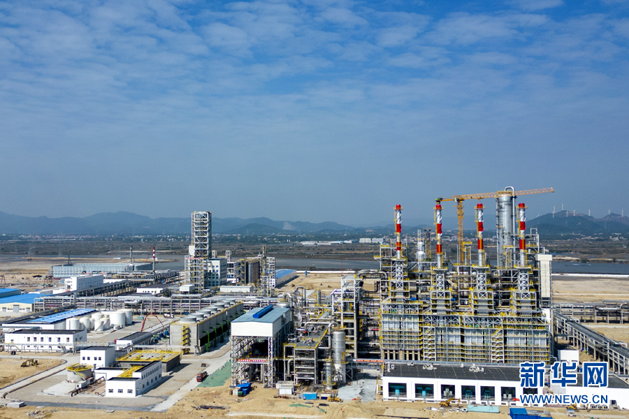 圖為2023年1月1日廣東茂名東華能源(茂名)烷烴資源利用項目一期工地現場,施工人員在搭建腳手架。新華網發 (劉武基 攝)
