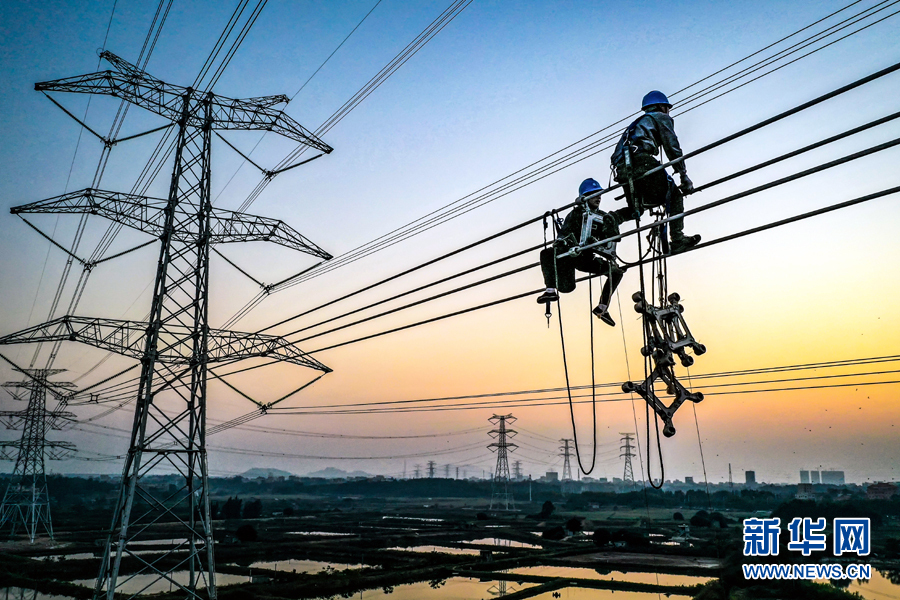 2023年1月1日,施工人員正在高空冒著寒風檢查工地用電基礎設施。新華網發 (劉武基 攝)