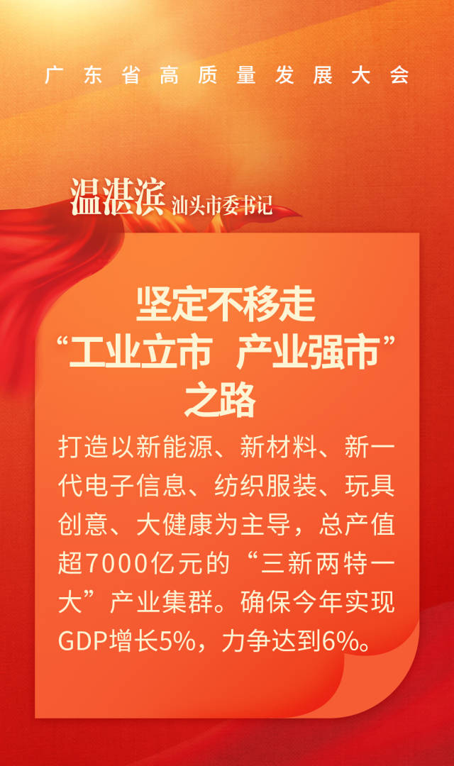 汕頭市委書記溫湛濱表示,汕頭將貫徹落實黨的二十大精神和省委工作部署,堅定不移走“工業立市 產業強市”之路,堅持制造業當家,打造以新能源、新材料、新一代電子信息、紡織服裝、玩具創意、大健康為主導,總產值超7000億元的“三新兩特一大”產業集群。辦好2023年“中數大會”、服博會、玩博會、南澳科學會議,建設國際風電創新港和數字經濟特區。構建“3+2+2”高鐵通道和“5+3+3”高速公路通道,打造高水平全國性綜合交通樞紐。推動城鄉區域協調發展和綠美汕頭生態建設,推進深圳—汕頭深度協作,探索與深圳共建飛地經濟。謀劃國家支持汕頭經濟特區一攬子政策落地準備工作,高標準規劃建設大型出口加工產業區,優化提升營商環境。高水平籌辦2024年第二十二屆國際潮團聯誼年會和第十屆國際潮商大會。汕頭將確保實現GDP增長5%、力爭達到6%,為全省經濟增長作出應有貢獻。