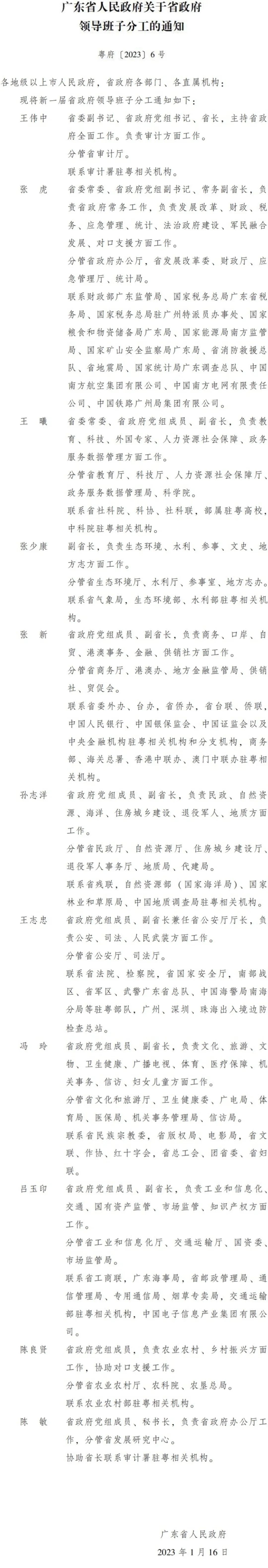 2月6日,廣東省人民政府官網公布《廣東省人民政府關于省政府領導班子分工的通知》,通知全文如下: