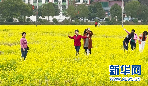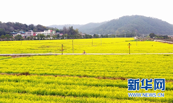 田野上金燦燦的油菜花給村莊添了一道靚麗的風景,吸引眾多游客前來踏春賞花。新華網發(梅州市梅縣區融媒體中心供圖)