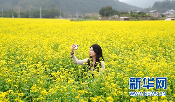 游客在油菜花中拍照打卡。新華網發(梅州市梅縣區融媒體中心供圖)