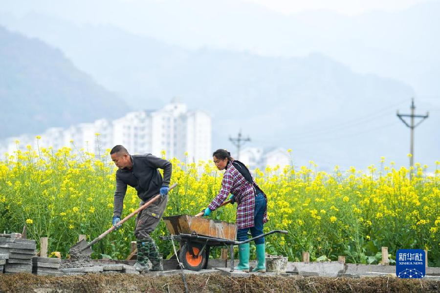2月17日,貴州省從江縣貫洞鎮的農民在修整田埂。