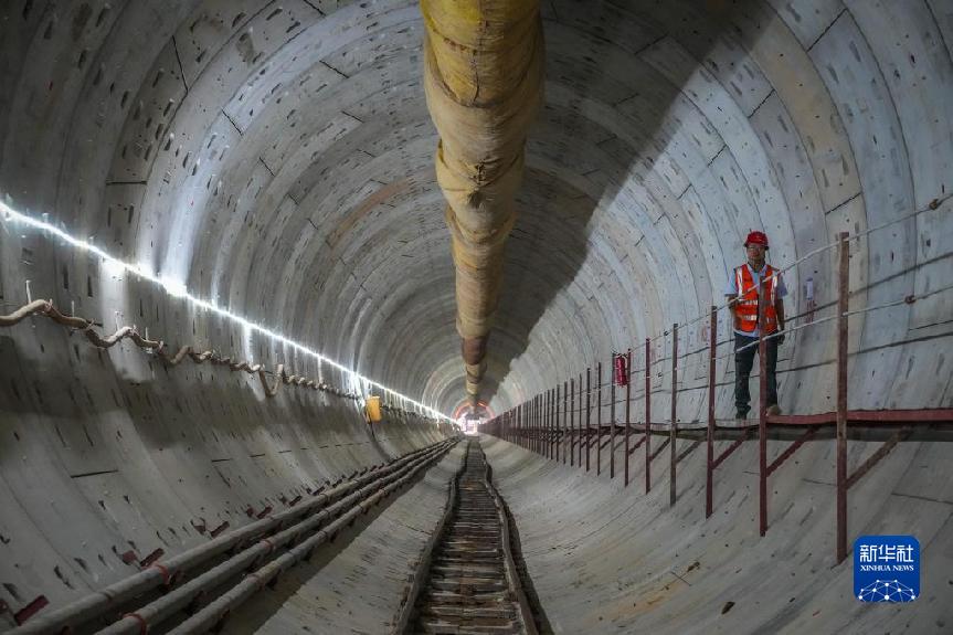 2月25日,一名技術員行走在貫通的東莞地鐵1號線水濂山站右線盾構隧道內。新華社記者 劉大偉 攝