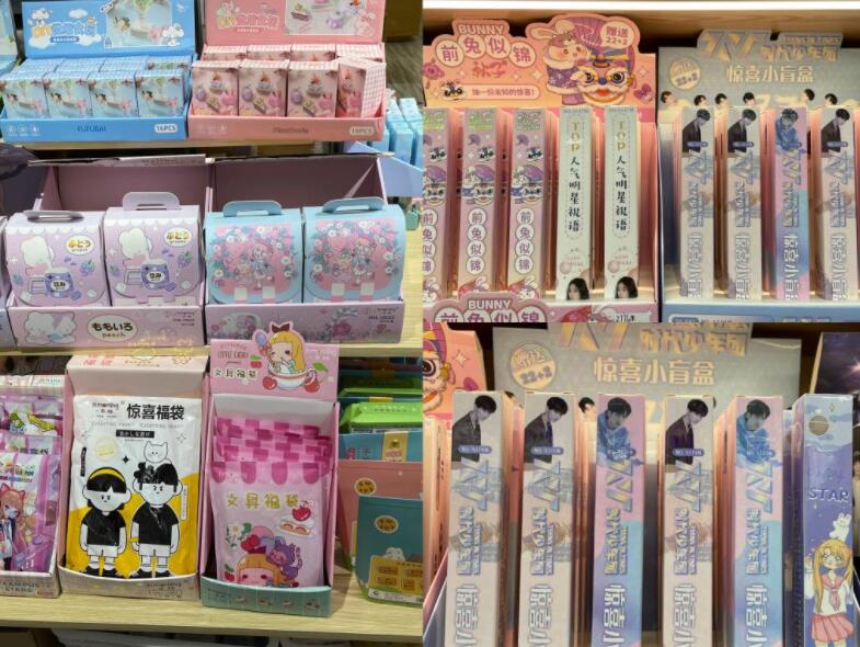 在貴陽、沈陽等地,部分中小學周邊的文具店里,“中性筆盲盒”“橡皮盲盒”“文具盲袋”等盲盒類學具仍被商家擺在顯著位置銷售。