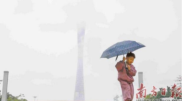 3月27日,廣州細雨連綿,霧氣籠罩,廣州塔等建筑若隱若現。圖為小朋友撐著雨傘走在花城廣場。南方日報記者 張令 攝