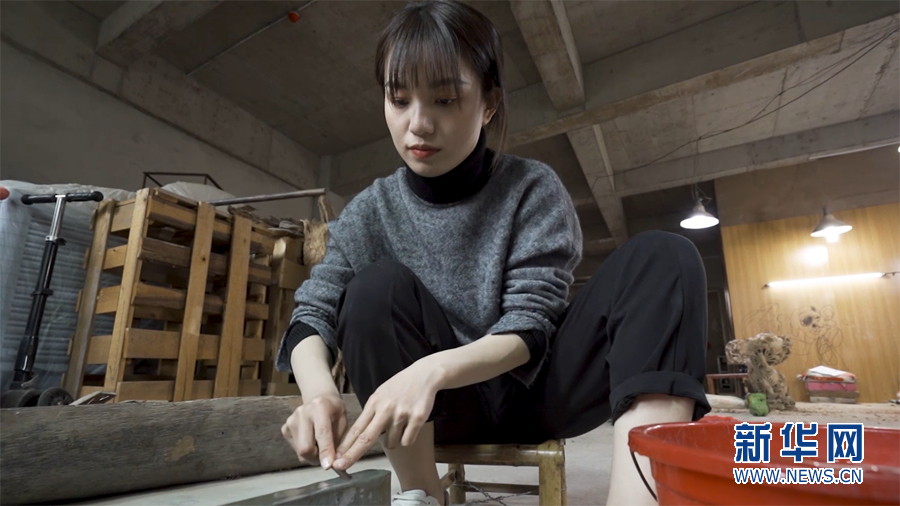 學習木雕要從磨刀練起,陳嘉的手經常被刀劃傷。新華網發(林堉 攝)