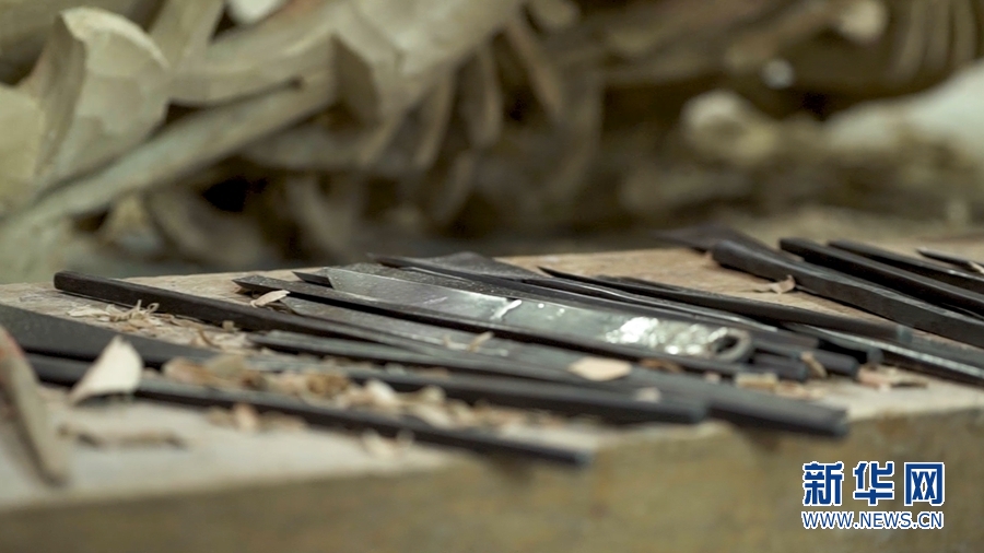 制作木雕作品,需要多把不同長度的刻刀和大小不一的木槌。新華網發(林堉 攝)
