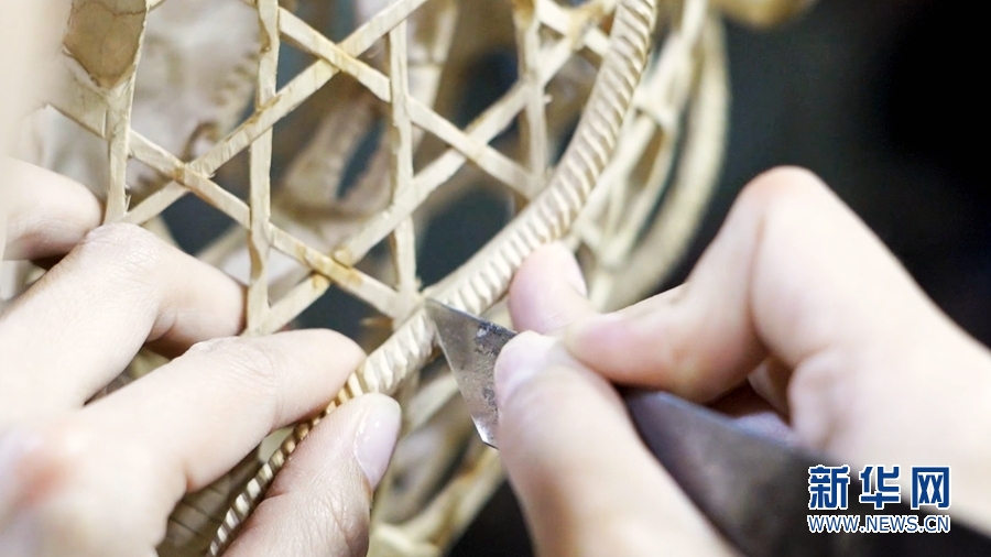 龍蝦蟹簍是潮州木雕中的代表作,陳嘉正用刻刀做精細部分。新華網發(林堉 攝)