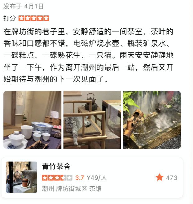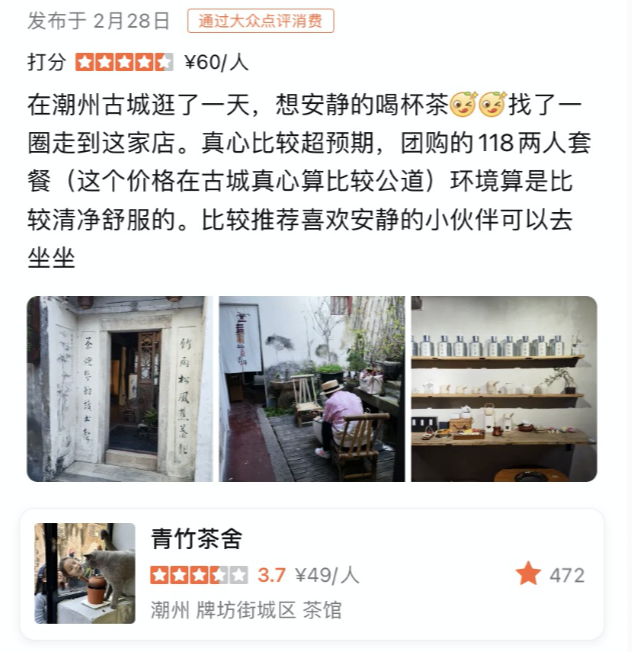????“適合旅游累了歇腳,環境清幽,度過了難忘的下午?!薄斑@家讓我們感受了一把潮州茶文化?!薄霸跓狒[牌坊街里難得的寂靜好去處,團購套餐劃算,可以體驗沖茶?!贝蟊婞c評上,不少外地游客留下了筆記攻略和體驗評價。
