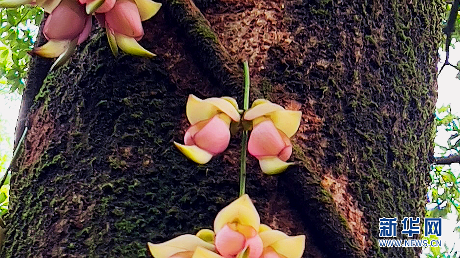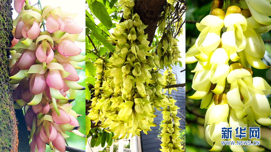 禾雀花是國家二級保護植物,花穗呈簇串狀,花形酷似雀鳥。盛開時為檸檬黃,再變為粉紅色、橙紅色。新華網發(胡東和 攝)