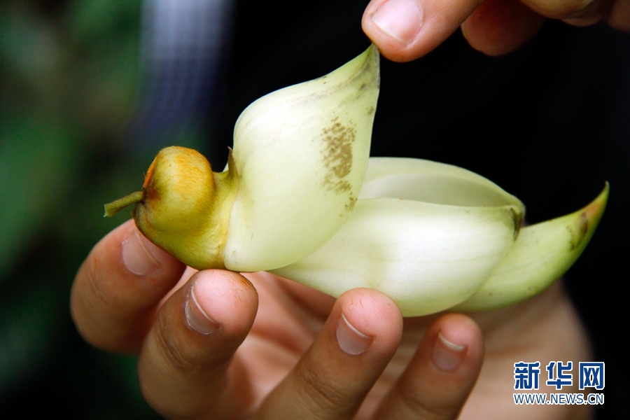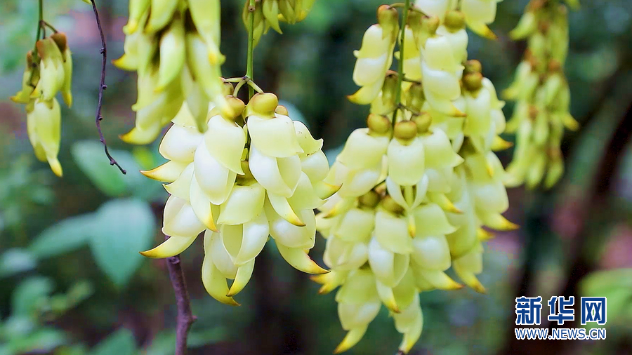 禾雀花初開時為淡綠色或者乳白色,花萼上棕色絨毛宛如麻雀的兩只小眼睛。新華網發(羅素玲 攝)