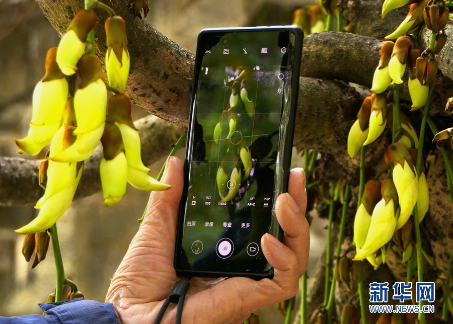 酷似小鳥的禾雀花吸引游客拍照留念。新華網發(佘建新 攝)