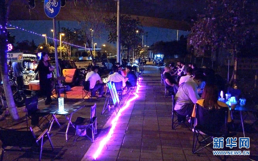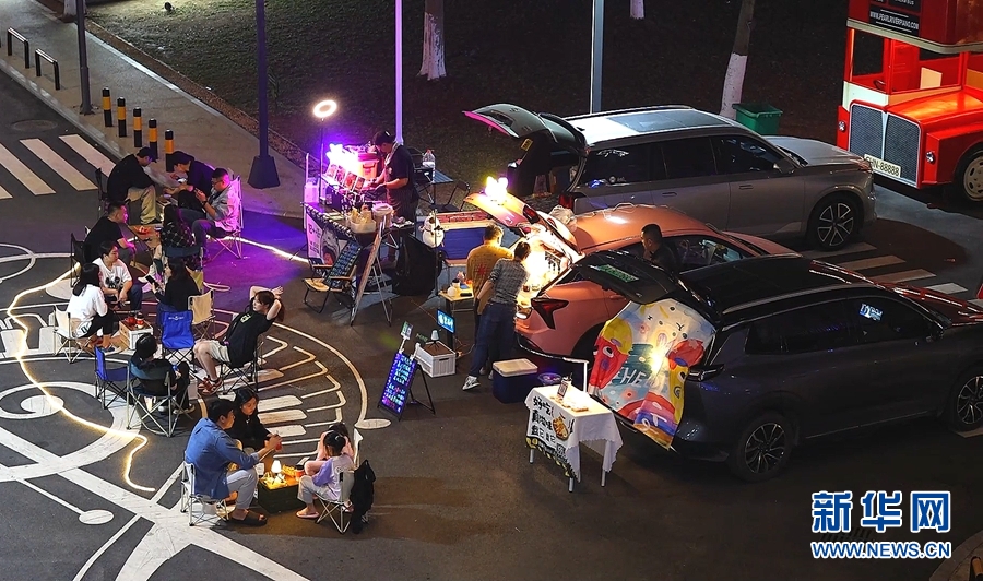晚上的車尾箱集市,燒烤、炸串、酸奶車……各式特色小攤格外吸睛。新華網發(江河水 攝)