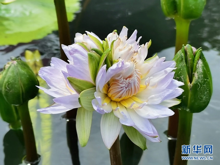 近日,廣州市番禺區蓮花山旅游區發現一睡蓮植株同時開出多朵多心和多蒂的花。新華網發(圖為廣州蓮花山景區提供)