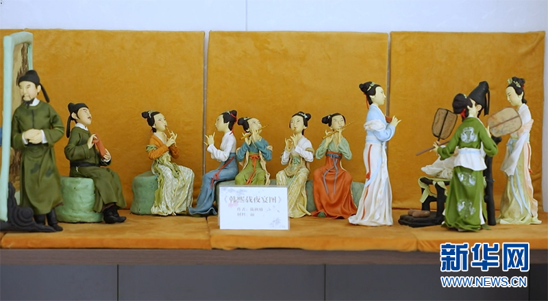 陳秋敏表示,面塑最初吸引自己的就是捏塑過程中的趣味性。面團經過揉捏,變成栩栩如生的形象。圖為陳秋敏耗時兩個月制作的面塑作品——《韓熙載夜宴圖》。新華網發(黎天智 攝)