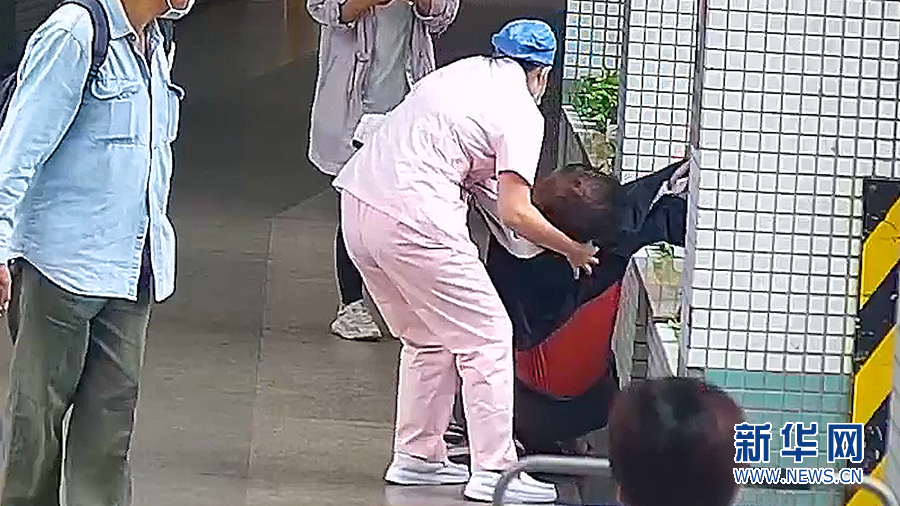 近日,廣州一名患者陳伯(化名)在醫院走道突發心臟驟停,熱心路人見狀找到吳曉雪對其實施心肺復蘇。新華網發(視頻監控畫面)