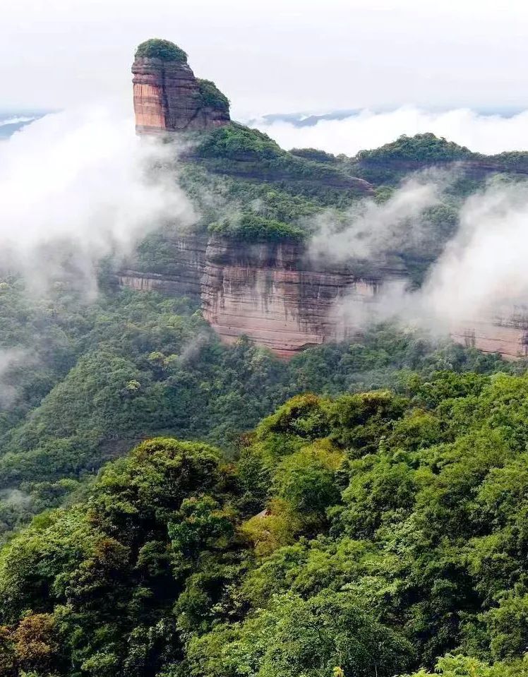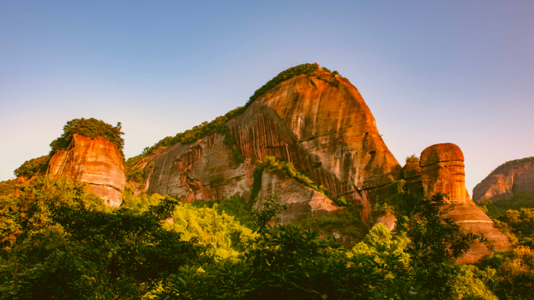 丹霞山景區中有一座像僧帽一樣的山,叫僧帽峰。它下面的山體是傳統意義上的丹霞山。以前丹霞山就是一座山的名字,后來這里開發成景區,整個景區亦叫做丹霞山,全都是赤壁丹崖之貌。在總共不到300平方公里的范圍內,有680座大小不等的石峰、石柱、石墻。