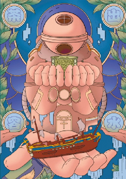 金獎作品“出水茶容”以從瑞典“哥德堡號”沉船打撈出水的、經廣州出口的福建白毫茶為元素,將這藏于廣州博物館中、見證了“海絲”繁榮的大宗出口品與潛水員打撈其出水的場景相結合,加以藝術化加工,造成了一件既有古韻又有當代設計表達趣味的佳作。