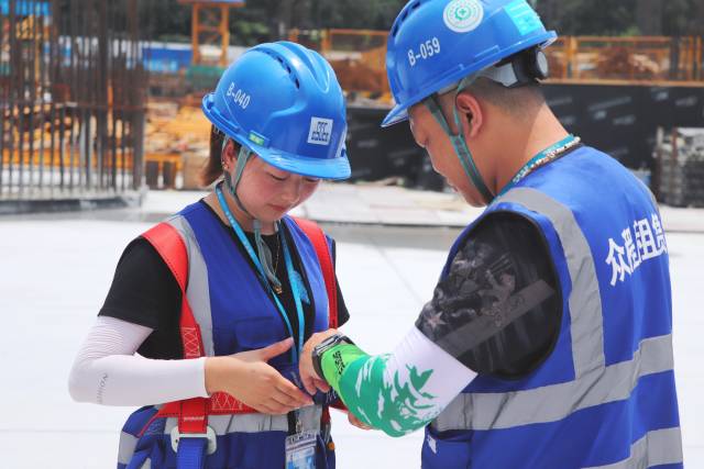 從項目環場走到二標段,一眼便可以看到塔吊下一男一女準備上崗前的身影,只見趙洪發正在為陳曉霞套上安全帶,動作一絲不茍,等陳曉霞穿好安全帶了,趙洪發還要再仔細檢查幾遍,確保安全帶扣得穩固、扎實?!皠e看我愛人長得一副‘糙漢’樣,實則心細得很,每次上塔吊前都親自給我戴安全帽、系安全帶?!标悤韵夹χf道。待準備完畢,趙洪發目送陳曉霞打開塔吊底下的鋼筋網門,戴上手套,一步一步地爬上約莫50米高的“云梯”。