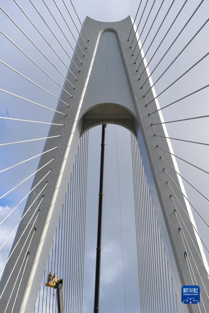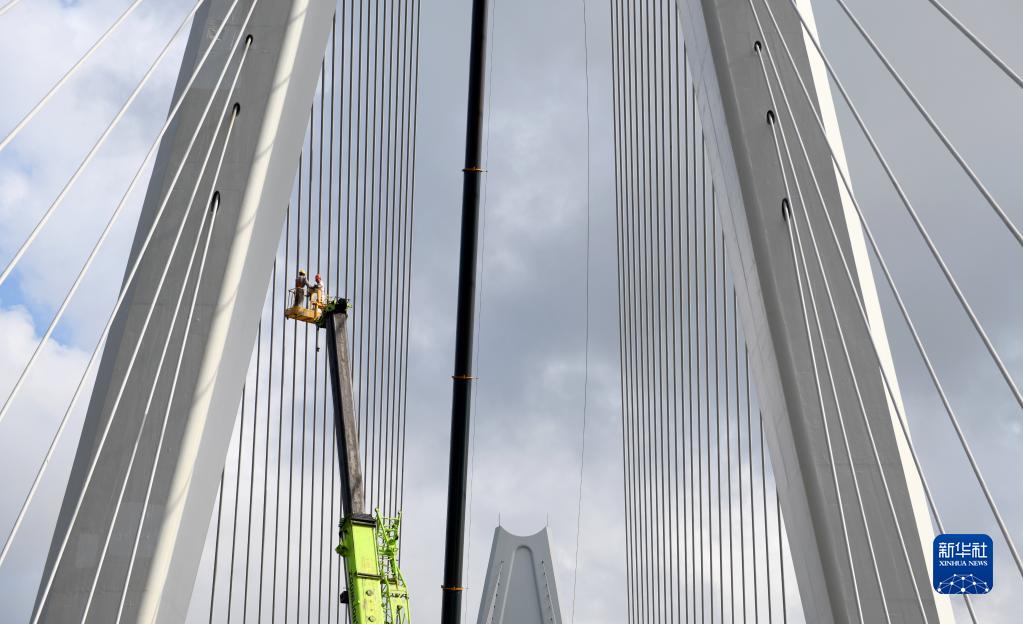 5月25日,工人在鷺洲大橋上準備安裝護欄。新華社記者 劉大偉 攝