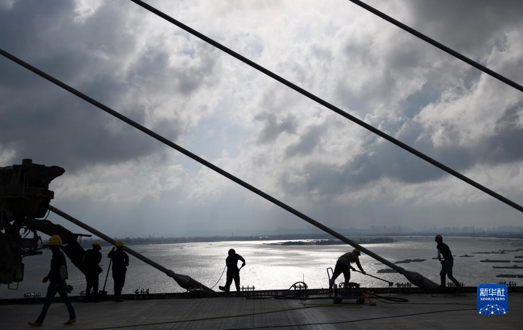 5月25日,建筑工人在鷺洲大橋修筑橋面。新華社記者 毛思倩 攝