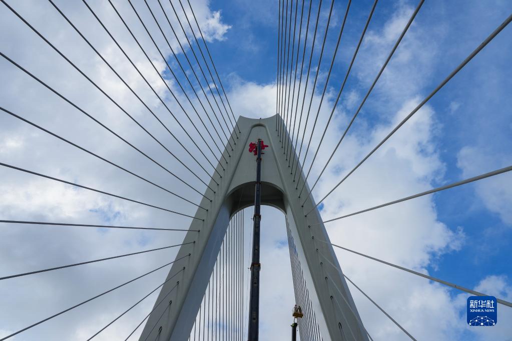 5月25日,工人在鷺洲大橋橋塔上吊裝大橋名字。新華社記者 劉大偉 攝