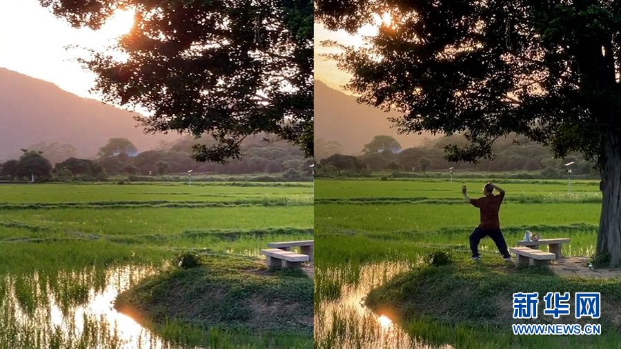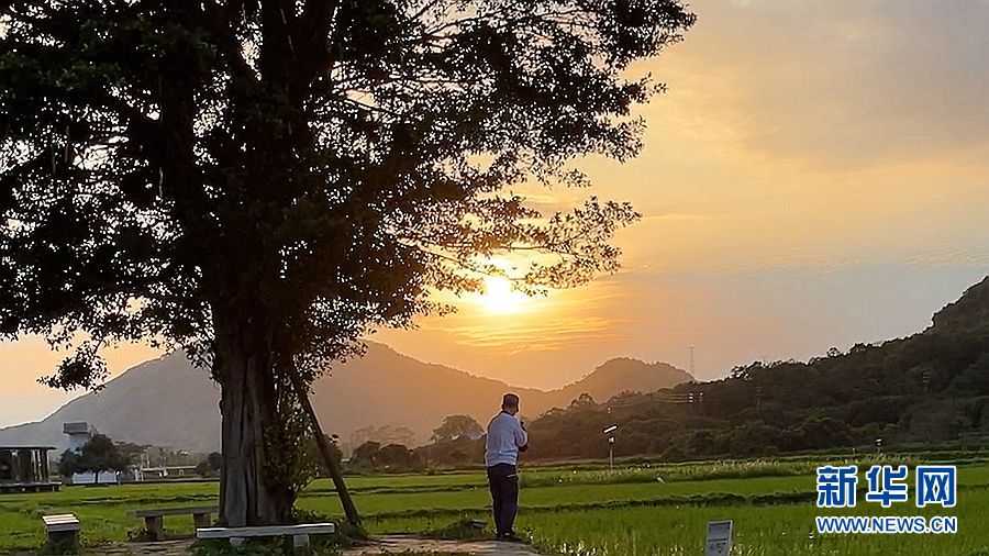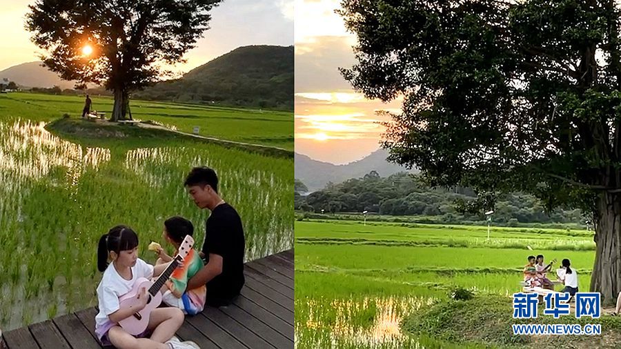 落日晚霞映照下的綠樹、農田和玩樂的人們相映成趣。新華網發(佘建新 攝)