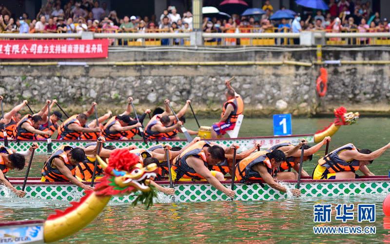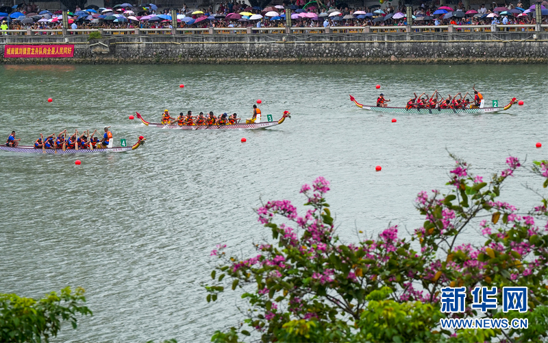 伴隨著鏗鏘有力的鼓聲,整齊劃一的劃槳節奏越來越快,平靜的墨江兩岸瞬間變成了熱鬧的海洋。新華網發 (始興縣融媒體中心供圖)