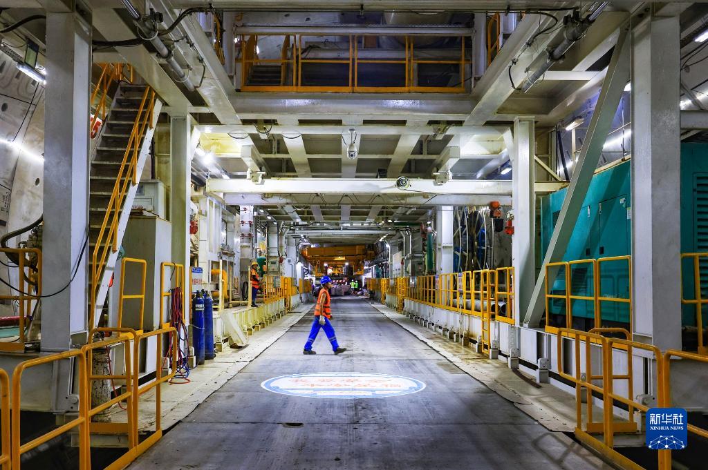 6月8日,施工人員走過深圳媽灣跨海通道“媽灣號”盾構機。新華社發(李小勇攝)
