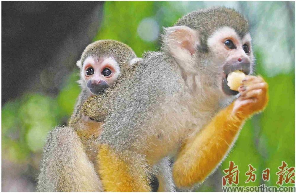 6月12日,在深圳野生動物園,兩只母松鼠猴分別馱著各自的猴寶寶,呵護備至。猴寶寶圓圓的眼睛炯炯有神,口緣和鼻吻部黑色斑塊形成墮圓形,耳緣、鼻梁、臉頰均有白色茸毛,十分可愛。目前,這兩只猴寶寶均為10多天大,身體發育良好。