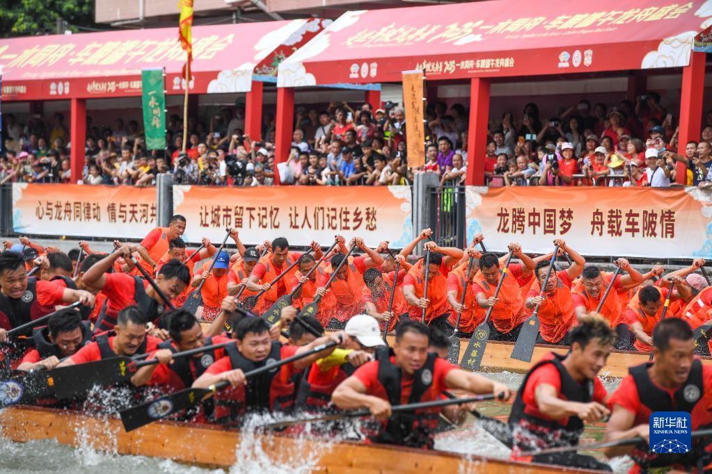 自農歷四月初八“起龍舟”開始,廣州地區就開啟了劃龍舟、迎端午的年度大戲。6月15日,車陂村12條龍船在車陂涌進行龍舟競渡。