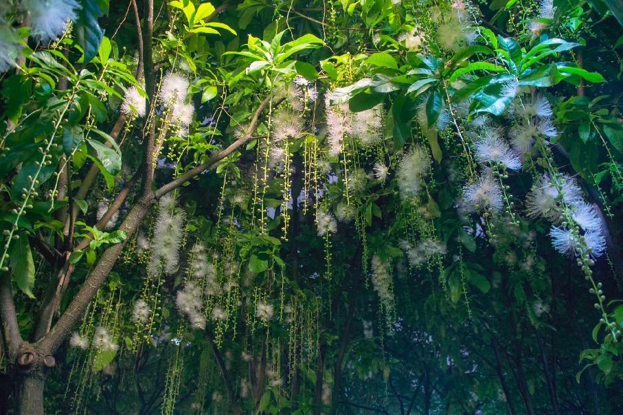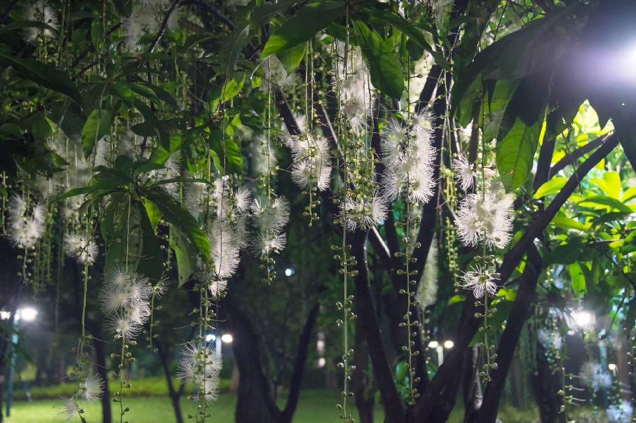 近日,廣州珠江公園百花園里,一種花期在晚上的玉蕊正悄然綻放。作為極具特色的觀賞花卉之一,玉蕊樹姿優雅,枝葉婆娑,花香四溢。玉蕊花期較長,可見證一整個盛夏,但玉蕊常于傍晚開花,至凌晨便會飄落,曇花一現,可謂“月下仙子”。