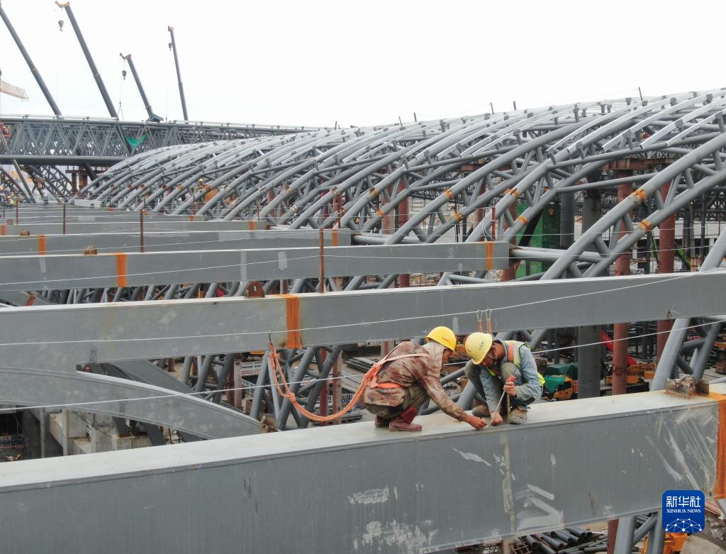 6月19日,工人在廣州白云火車站鋼結構框架上施工作業(無人機照片)。
